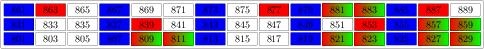 gap> cls := IP_ColorsCompRedTones;; gap> rg := Filtered([801..889],u->(u mod 2)<>0);; gap> flen := 15;; gap> twins := Filtered(Primes, p -> p + 2 in Primes);; gap> arr := [Primes,Union(twins,twins+2),Filtered(rg,u->(u mod 3)=0)];; gap> tkz := IP_TikzArrayOfIntegers(rg,flen,rec(colors := cls,highlights:=arr));;