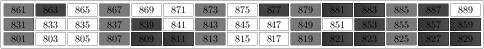 gap> cls := IP_ColorsDGrayTones;; gap> rg := Filtered([801..889],u->(u mod 2)<>0);; gap> flen := 15;; gap> twins := Filtered(Primes, p -> p + 2 in Primes);; gap> arr := [Primes,Union(twins,twins+2),Filtered(rg,u->(u mod 3)=0)];; gap> tkz := IP_TikzArrayOfIntegers(rg,flen,rec(colors := cls,highlights:=arr));;