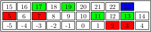 gap> rg := [-5..23];; gap> len := 10;; gap> hg := rec();; gap> hg.highlights:=[[2,3,5,7],[11,13,17,19],[23]];; gap> tkz := IP_TikzArrayOfIntegers(rg,len,hg);; gap> Print(tkz); gap> #IP_Splash(tkz); gap> hg.negatives:=false;; gap> tkz := IP_TikzArrayOfIntegers(rg,len,hg);; gap> Print(tkz); gap> # IP_Splash(tkz);