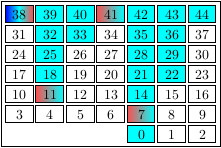 gap> ns := NumericalSemigroup(7,11,38,41);; gap> highlights := ["conductor", "min_generators", "small_elements"];; gap> options := rec(ns_table:=true,colors:=["blue", "red!70", "-red", "black!40"]);; gap> tkz := TikzCodeForNumericalSemigroup(ns,highlights,options);; gap> IP_Splash(tkz); gap> tkz := TikzCodeForNumericalSemigroup(ns,highlights,rec(ns_table:=true));; gap> IP_Splash(tkz);
