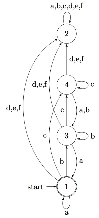 < deterministic automaton on 6 letters with 4 states >