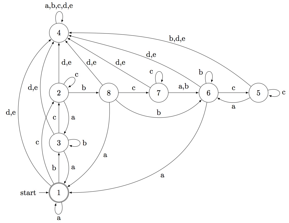 < deterministic automaton on 5 letters with 8 states >