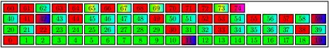 gap> #LoadPackage("numericalsgps"); gap> gap> ns := NumericalSemigroup(11,19,30,42,59);; gap> cls := ShuffleIP_Colors([IP_ColorsGreenTones,IP_ColorsCompBlueTones]);; gap> flen := 20;; gap> #some notable elements gap> arr := [SmallElementsOfNumericalSemigroup(ns), > GapsOfNumericalSemigroup(ns), > MinimalGeneratingSystemOfNumericalSemigroup(ns), > FundamentalGapsOfNumericalSemigroup(ns), > [ConductorOfNumericalSemigroup(ns)], > PseudoFrobeniusOfNumericalSemigroup(ns)];; gap> gap> tkz := IP_TikzArrayOfIntegers(flen,rec(colors := cls,highlights:=arr));;