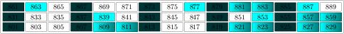 gap> rg := Filtered([801..889],u->(u mod 2)<>0);; gap> flen := 15;; gap> twins := Filtered(Primes, p -> p + 2 in Primes);; gap> arr := [Primes,Union(twins,twins+2),Filtered(rg,u->(u mod 3)=0)];; gap> tkz := IP_TikzArrayOfIntegers(rg,flen,rec(highlights:=arr));;
