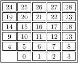 gap> ns := NumericalSemigroup(5,7);; gap> tkz := TikzCodeForNumericalSemigroup(ns,["ns_table"],rec(negatives:=false)); #I In order to highlight some element, please use a list with one or more of the options given as strings: pseudo_frobenius, min_generators, frobenius_number, conductor, special_gaps, fundamental_gaps, small_elements "%tikz\n\\begin{tikzpicture}[every node/.style={draw,scale=1pt,\nminimum width\ =20pt,inner sep=3pt,\nline width=0pt,draw=black}]\n\\matrix[row sep=2pt,column\ sep=2pt]\n{\\node[]{24};&\n\\node[]{25};&\n\\node[]{26};&\n\\node[]{27};&\n\\\ node[]{28};\\\\\n\\node[]{19};&\n\\node[]{20};&\n\\node[]{21};&\n\\node[]{22};\ &\n\\node[]{23};\\\\\n\\node[]{14};&\n\\node[]{15};&\n\\node[]{16};&\n\\node[]\ {17};&\n\\node[]{18};\\\\\n\\node[]{9};&\n\\node[]{10};&\n\\node[]{11};&\n\\no\ de[]{12};&\n\\node[]{13};\\\\\n\\node[]{4};&\n\\node[]{5};&\n\\node[]{6};&\n\\\ node[]{7};&\n\\node[]{8};\\\\\n&\n\\node[]{0};&\n\\node[]{1};&\n\\node[]{2};&\ \n\\node[]{3};\\\\\n};\n\\end{tikzpicture}\n"