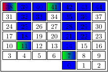 gap> ns := NumericalSemigroup(7,11,38,41);; gap> highlights := ["conductor", "min_generators", "small_elements"];; gap> options := rec(ns_table:=true,colors:=["blue", "red!70", "-red", "black!40"]);; gap> tkz := TikzCodeForNumericalSemigroup(ns,highlights,options);; gap> IP_Splash(tkz); gap> tkz := TikzCodeForNumericalSemigroup(ns,highlights,rec(ns_table:=true));; gap> IP_Splash(tkz);