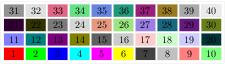 gap> m3 := Filtered([1..40],i->i mod 3=0); [ 3, 6, 9, 12, 15, 18, 21, 24, 27, 30, 33, 36, 39 ] gap> m5 := Filtered([1..40],i->i mod 5=0); [ 5, 10, 15, 20, 25, 30, 35, 40 ] gap> m7 := Filtered([1..40],i->i mod 7=0); [ 7, 14, 21, 28, 35 ] gap> gap> arr := [[],[],m3,[],m5,[],m7];; gap> tkz:=IP_TikzArrayOfIntegers([1..40],10,rec(highlights:=arr));;