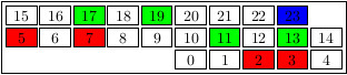gap> rg := [-5..23];; gap> len := 10;; gap> hg := rec();; gap> hg.highlights:=[[2,3,5,7],[11,13,17,19],[23]];; gap> tkz := IP_TikzArrayOfIntegers(rg,len,hg);; gap> Print(tkz); gap> #IP_Splash(tkz); gap> hg.negatives:=false;; gap> tkz := IP_TikzArrayOfIntegers(rg,len,hg);; gap> Print(tkz); gap> # IP_Splash(tkz);