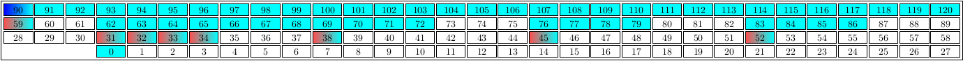 gap> ns := NumericalSemigroup(7,11,38,41);; gap> highlights := ["conductor", "min_generators", "small_elements"];; gap> options := rec(ns_table:=true,colors:=["blue", "red!70", "-red", "black!40"]);; gap> tkz := TikzCodeForNumericalSemigroup(ns,highlights,options);; gap> IP_Splash(tkz); gap> tkz := TikzCodeForNumericalSemigroup(ns,highlights,rec(ns_table:=true));; gap> IP_Splash(tkz);