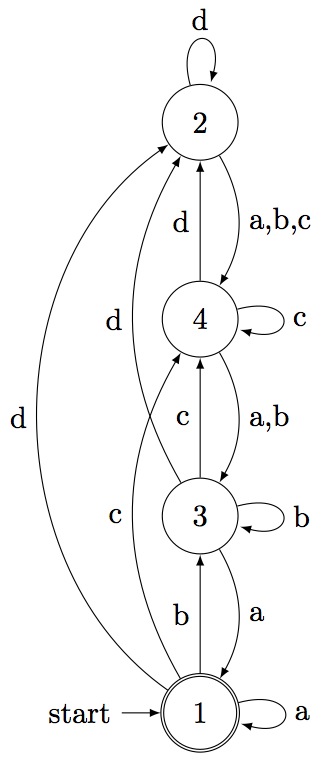 < deterministic automaton on 4 letters with 4 states >