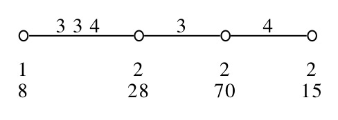 In case graphviz is not available on your system, you will get an friendly error message and a file filename.dot will be written. You can then compile this file later or ask a friend to help you. By default the diagram provides for each type i the i-order and the number of elements of type i. This behaviour can be changed by providing a vertexverbosity level. A value 2 results in no label under the vertices and a value 1 gives only the i-order. Any other positive integer value yields the default behaviour. The default labels for the edges of the diagram use the standard convention that a [g,dp,dl]-gon with all three parameters equal is labelled only with the number g. Putting edgeverbosity equal to 2 puts no labels at all. This yields the so called ``basic diagram'' of the geometry. With edgeverbosity equal to any integer greater than 2 all labels contain girth and both diameters.