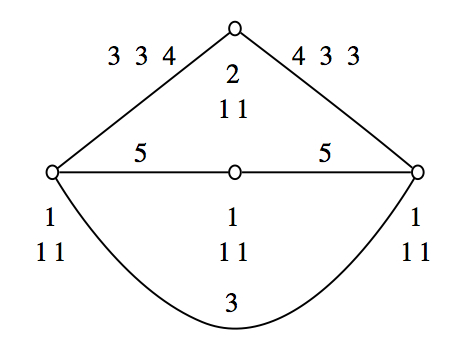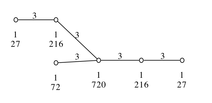 gap> L := SimpleLieAlgebra("E",6,Rationals); <Lie algebra of dimension 78 over Rationals> gap> rs := RootSystem(L); <root system of rank 6> gap> w := WeylGroup(rs); <matrix group with 6 generators> gap> gens := GeneratorsOfGroup(w);; gap> pabs := List(gens, g -> Group(Difference(gens, [g]))); [ <matrix group with 5 generators>, <matrix group with 5 generators>, <matrix group with 5 generators>, <matrix group with 5 generators>, <matrix group with 5 generators>, <matrix group with 5 generators> ] gap> g := Group(gens); <matrix group with 6 generators> gap> cg := CosetGeometry(g,pabs);; gap> diag := DiagramOfGeometry( cg );; #I Using NiceMonomorphism... #I Using NiceMonomorphism... #I Using NiceMonomorphism... #I Using NiceMonomorphism... #I Using NiceMonomorphism... #I Using NiceMonomorphism... #I Using NiceMonomorphism... #I Using NiceMonomorphism... #I Using NiceMonomorphism... #I Using NiceMonomorphism... #I Using NiceMonomorphism... #I Using NiceMonomorphism... #I Using NiceMonomorphism... #I Using NiceMonomorphism... #I Using NiceMonomorphism... gap> DrawDiagram(diag, "E6"); gap> #Exec("open E6.ps");