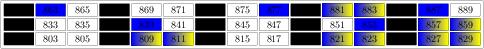 gap> cls := IP_ColorsDGrayTones;; gap> rg := Filtered([801..889],u->(u mod 2)<>0);; gap> flen := 15;; gap> twins := Filtered(Primes, p -> p + 2 in Primes);; gap> arr := [Primes,Union(twins,twins+2),Filtered(rg,u->(u mod 3)=0)];; gap> tkz := IP_TikzArrayOfIntegers(rg,flen,rec(colors := cls,highlights:=arr));;