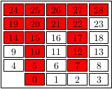 gap> ns := NumericalSemigroup(5,7);; gap> tkz := TikzCodeForNumericalSemigroup(ns,["ns_table"],rec(negatives:=false)); #I In order to highlight some element, please use a list with one or more of the options given as strings: pseudo_frobenius, min_generators, frobenius_number, conductor, special_gaps, fundamental_gaps, small_elements "%tikz\n\\begin{tikzpicture}[every node/.style={draw,scale=1pt,\nminimum width\ =20pt,inner sep=3pt,\nline width=0pt,draw=black}]\n\\matrix[row sep=2pt,column\ sep=2pt]\n{\\node[]{24};&\n\\node[]{25};&\n\\node[]{26};&\n\\node[]{27};&\n\\\ node[]{28};\\\\\n\\node[]{19};&\n\\node[]{20};&\n\\node[]{21};&\n\\node[]{22};\ &\n\\node[]{23};\\\\\n\\node[]{14};&\n\\node[]{15};&\n\\node[]{16};&\n\\node[]\ {17};&\n\\node[]{18};\\\\\n\\node[]{9};&\n\\node[]{10};&\n\\node[]{11};&\n\\no\ de[]{12};&\n\\node[]{13};\\\\\n\\node[]{4};&\n\\node[]{5};&\n\\node[]{6};&\n\\\ node[]{7};&\n\\node[]{8};\\\\\n&\n\\node[]{0};&\n\\node[]{1};&\n\\node[]{2};&\ \n\\node[]{3};\\\\\n};\n\\end{tikzpicture}\n"