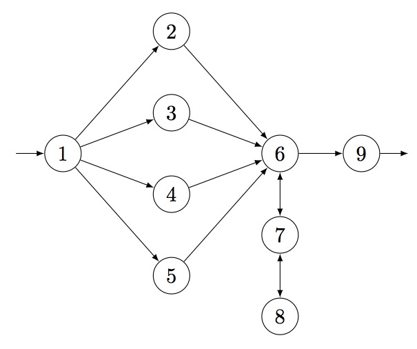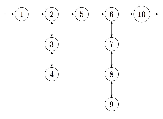 The token passing network containing a series of stacks of length 3, 1 and 4 looks as follows: